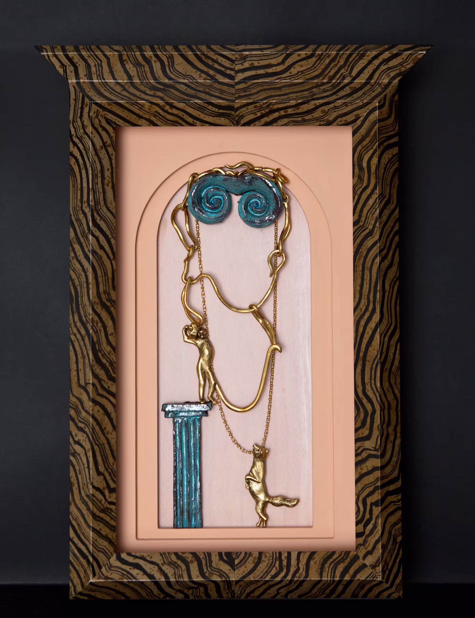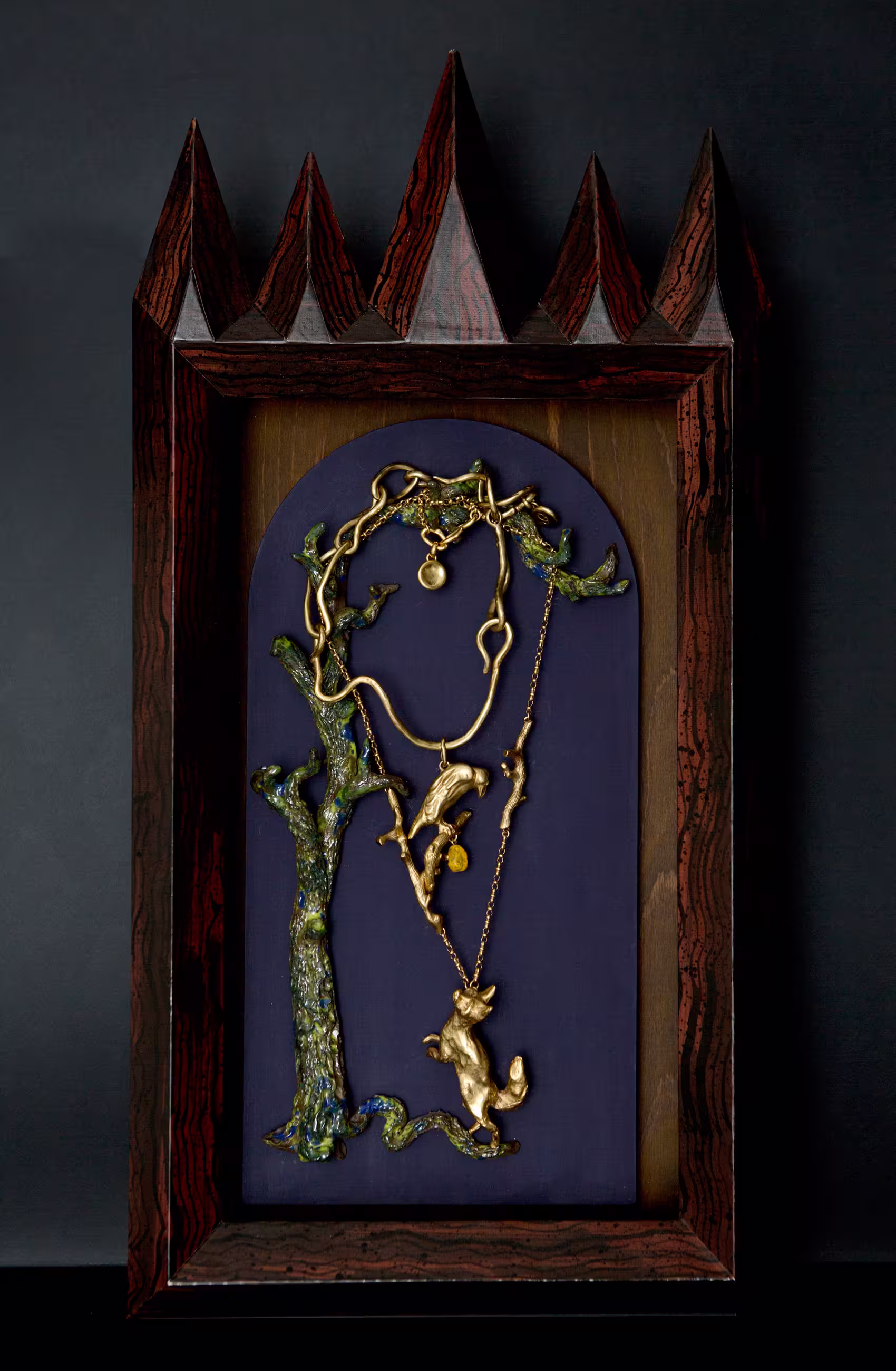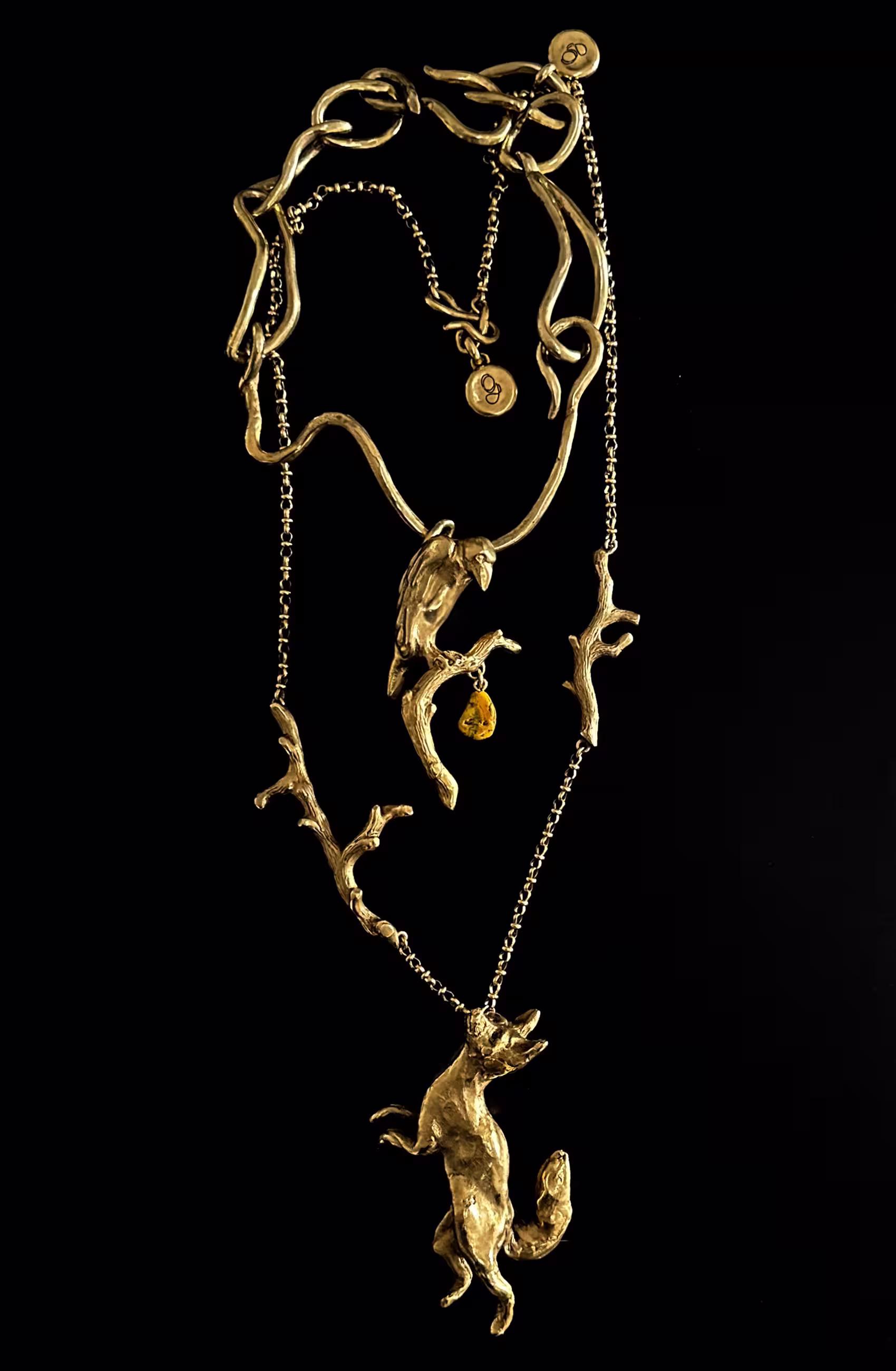 "Fables Etcetera" translates the timeless tales of Aesop and La Fontaine into sculptural jewellery. Through these stories—among the earliest philosophical reflections on human nature—animals become mirrors of emotion, instinct, and behaviour. Gabrielle selected eighteen fables, embarking on an allegorical journey where spirituality and animality intertwine, transforming narrative into form, and story into miniature worlds of art. After careful observation of attitude and expression, each character, boldly scaled for jewellery is first sculpted in wax, then cast in bronze and plated in gold or silver, with selected pieces further adorned with semi-precious stones. Each story is realised in five editions, and for the first edition, every creation is presented within its own Wunderkammer — a framed, miniature universe that allows the piece to be admired and experienced as art, even when not worn. From Le Corbeau et le Renard to other animal hero’s, the works explore determination, ingenuity, and the pursuit of creative expression, inter-wining the line between fable and reality. Gabrielle’s bronze creations bring these timeless narratives to life with a playful yet refined elegance, embodying the distinctive vision that defines her artistic practice.