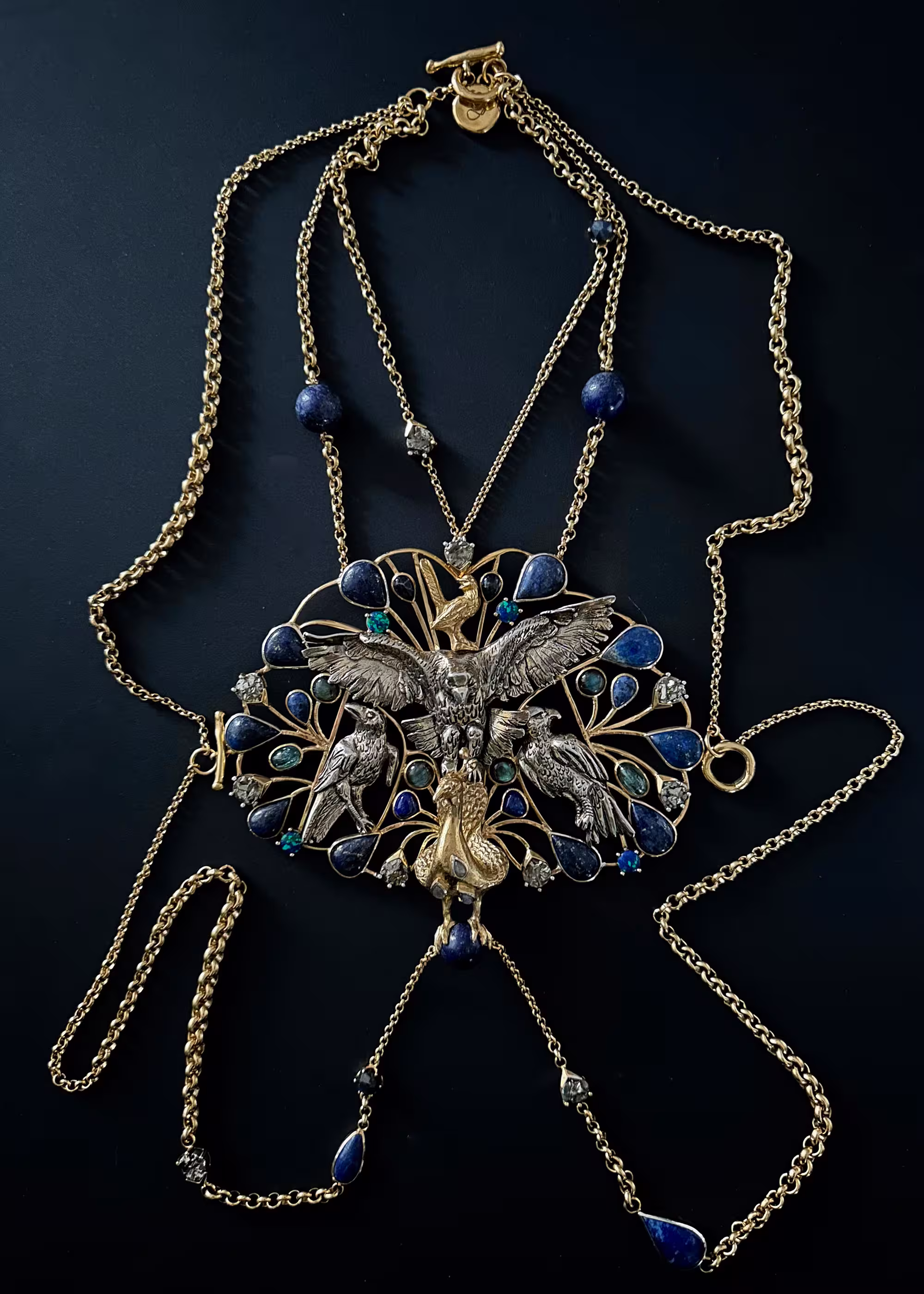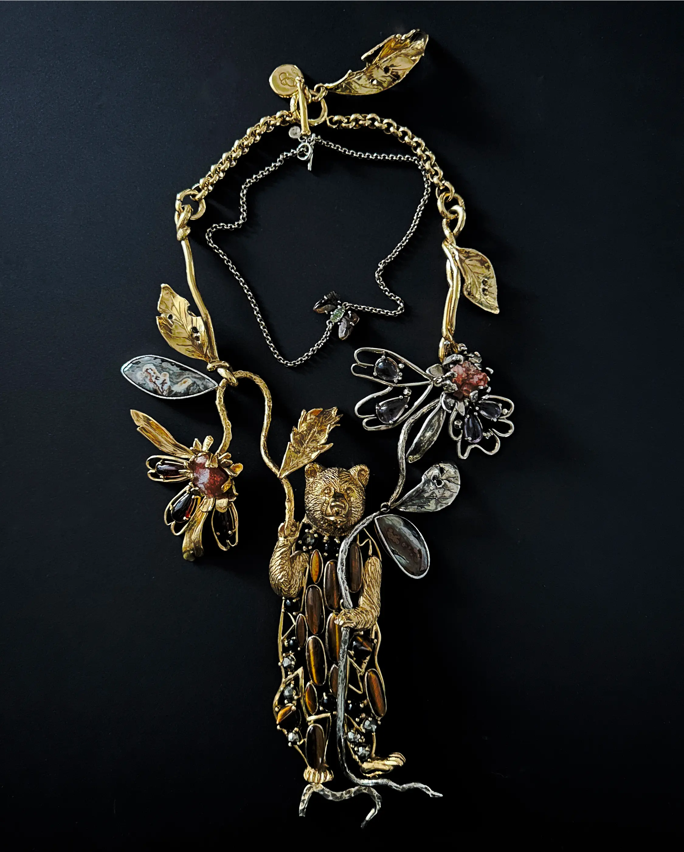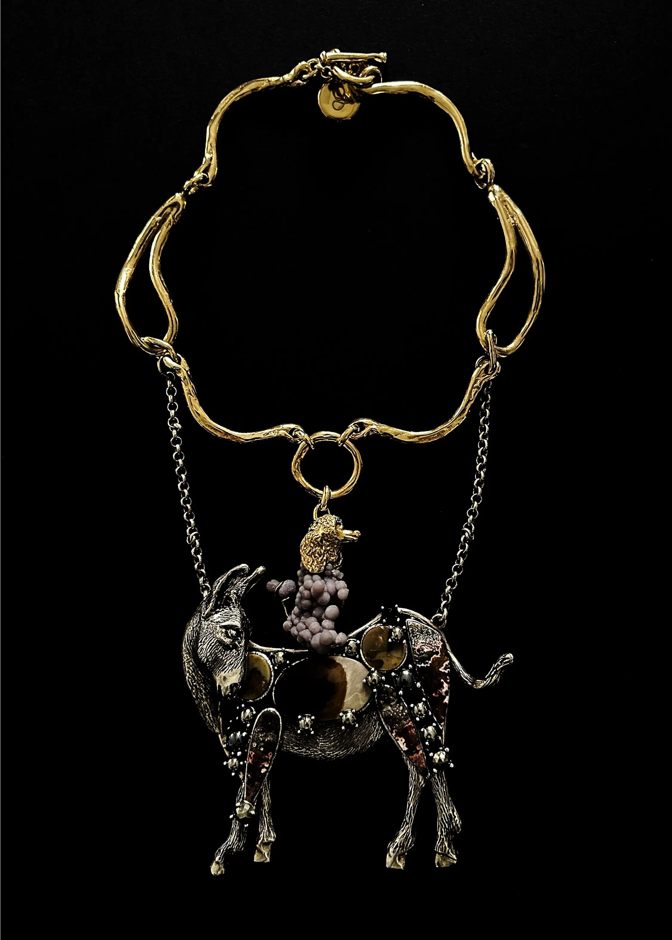 "Schatzkammer" finds its roots in Gabrielle’s childhood visits to the treasury of Munich’s Residenz — a place of wonder where precious stones and sculpted gold came alive as crowns, mythical creatures, and treasures of imagination. Her early fascination with transformation and storytelling takes form in her sculptural jewellery. The interpretation of five fables captures the irregular beauty of ancient treasures — intimate objects that carry both memory and myth, blending craftsmanship, symbolism, and emotion. Each animal figure is adorned with semi-precious stones, hand-set into delicate silver structures, crafted with the precision and poetry of haute couture embroidery.