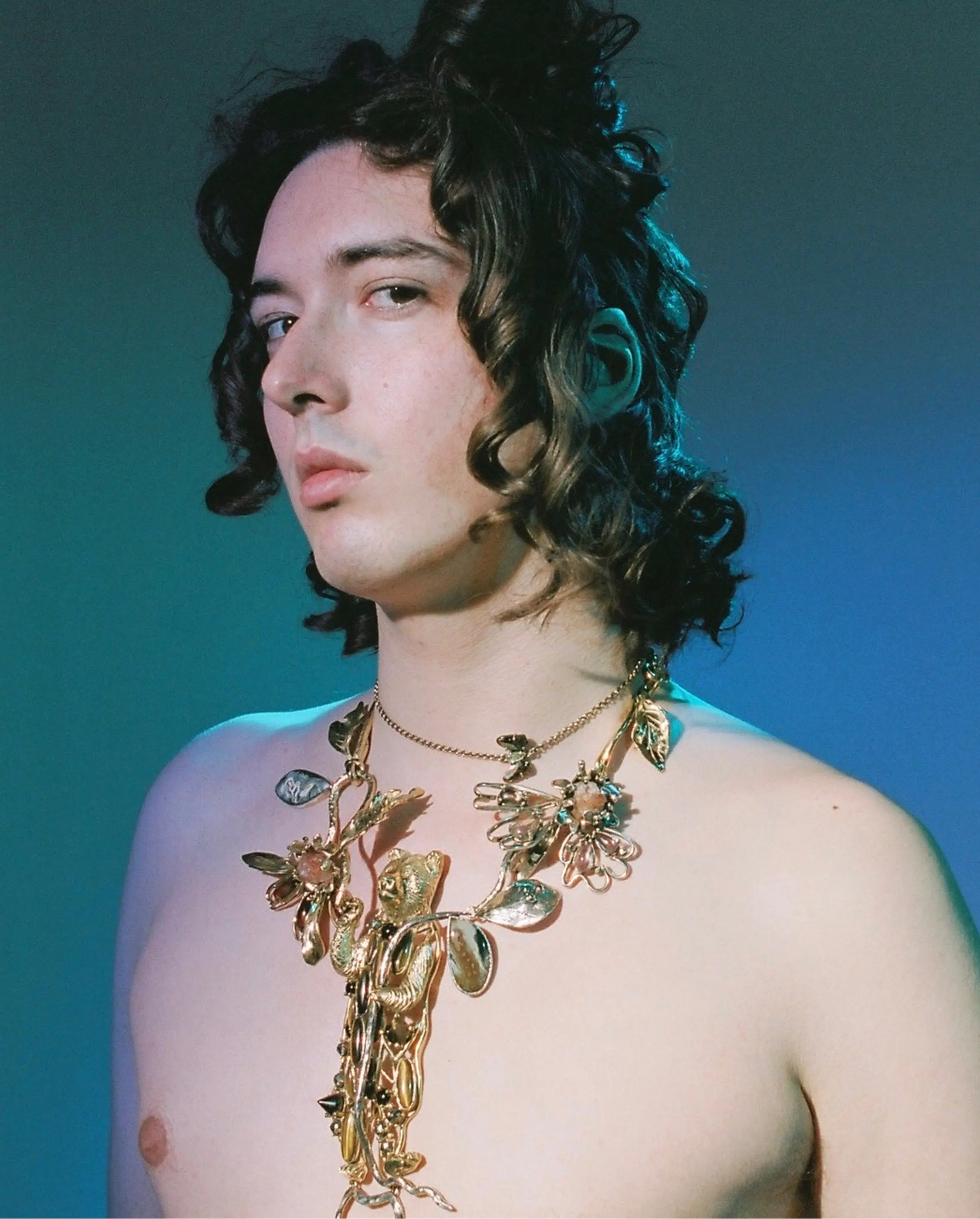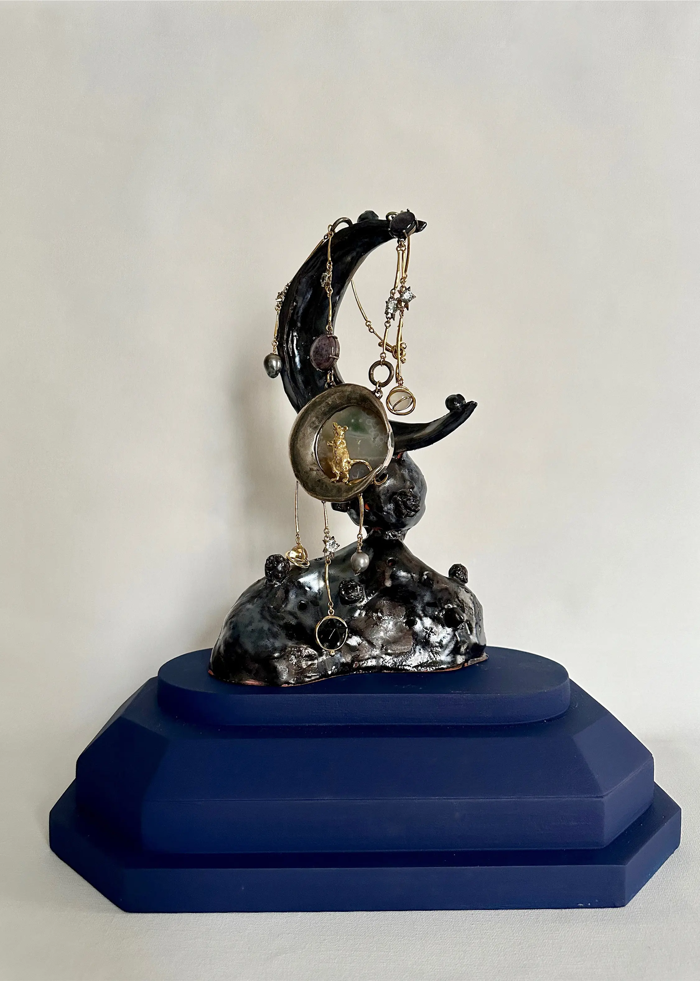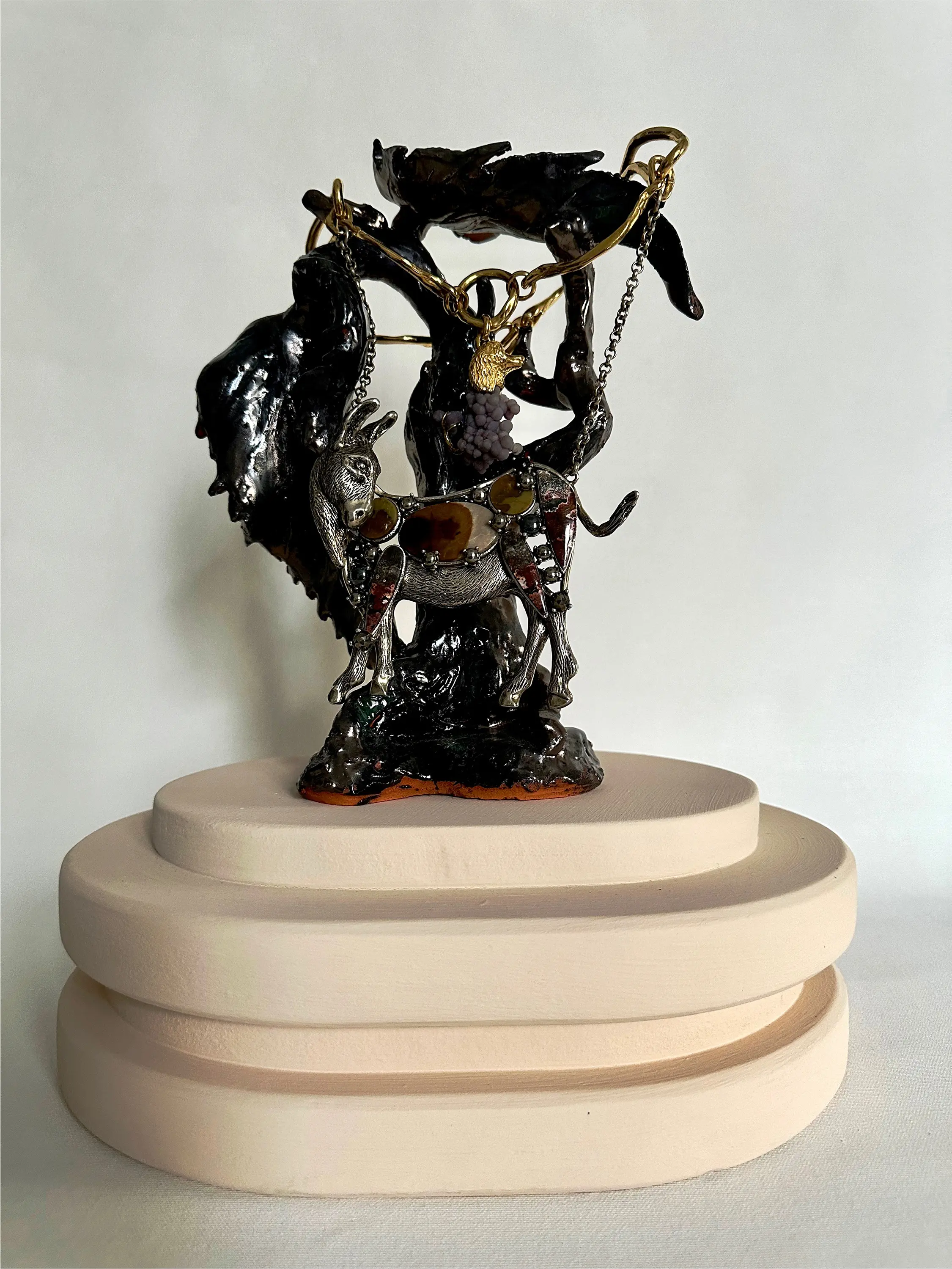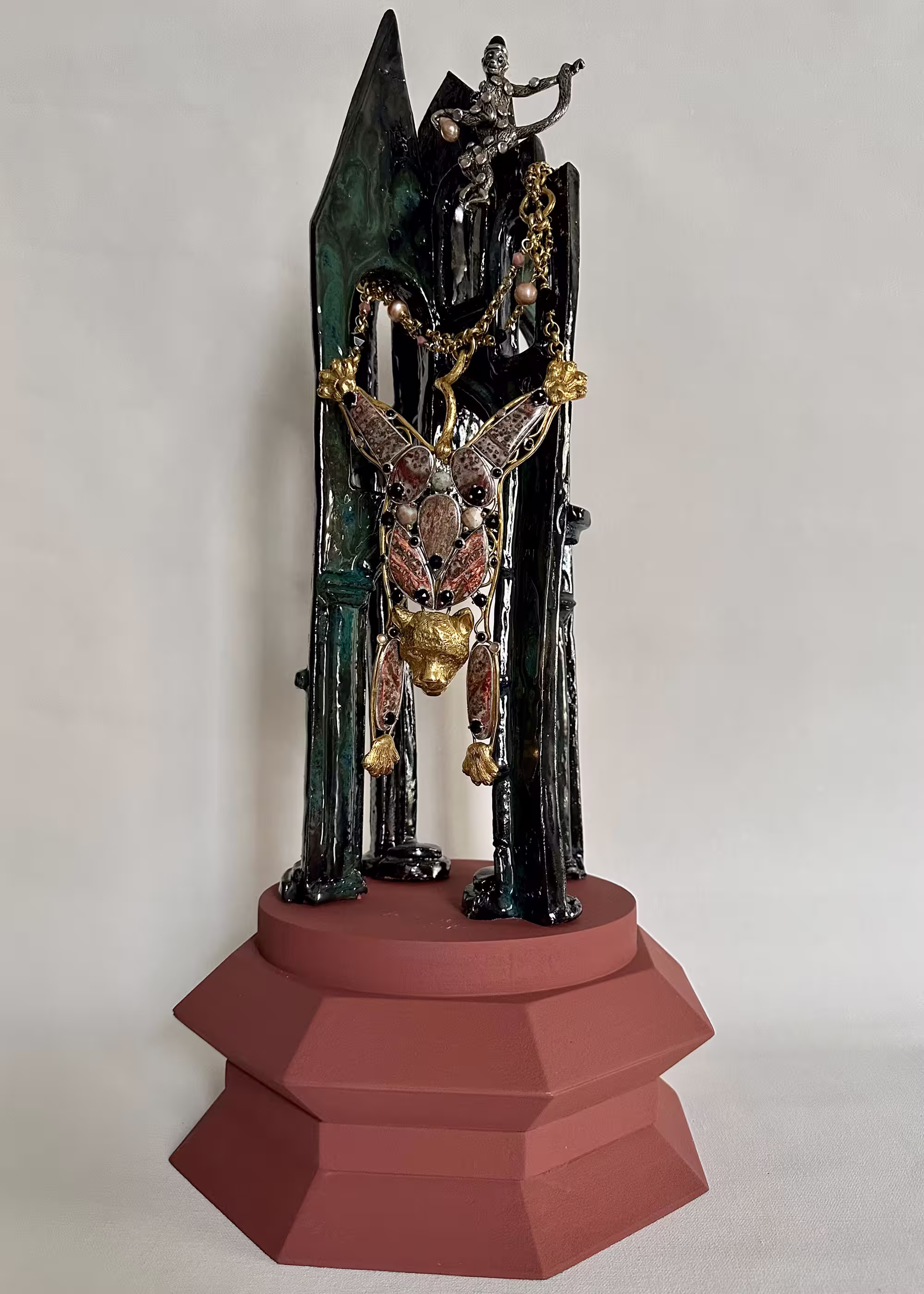 "Schatzkammer" finds its roots in Gabrielle’s childhood visits to the treasury of Munich’s Residenz — a place of wonder where precious stones and sculpted gold came alive as crowns, mythical creatures, and treasures of imagination. Her early fascination with transformation and storytelling takes form in her sculptural jewellery. The interpretation of five fables captures the irregular beauty of ancient treasures — intimate objects that carry both memory and myth, blending craftsmanship, symbolism, and emotion. Each animal figure is adorned with semi-precious stones, hand-set into delicate silver structures, crafted with the precision and poetry of haute couture embroidery.
