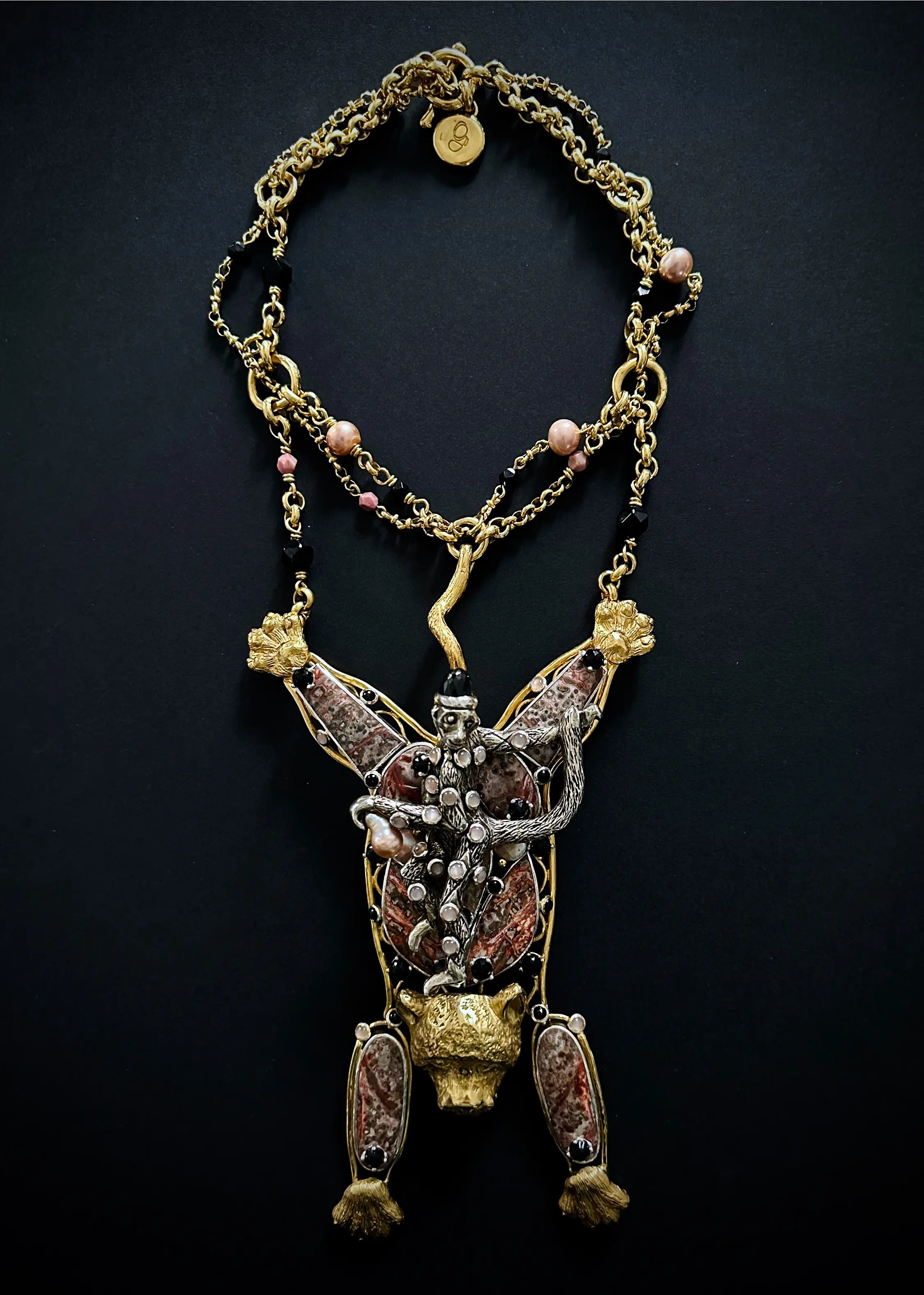 Collier: 15 x 32 cm silver, bronze: gold and silver plated stones: black onyx, pink rodhoite, leopard jasper, pink moonstone, black calzedonia, pearls