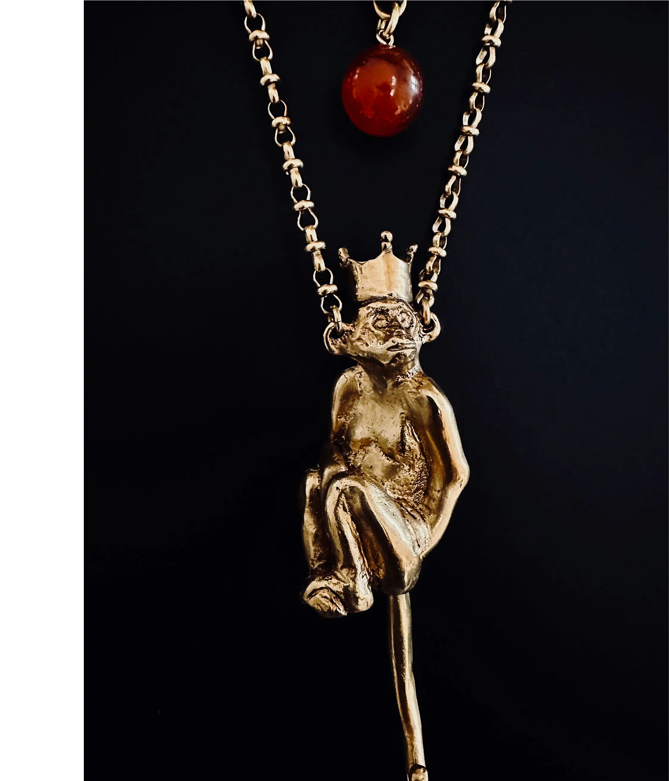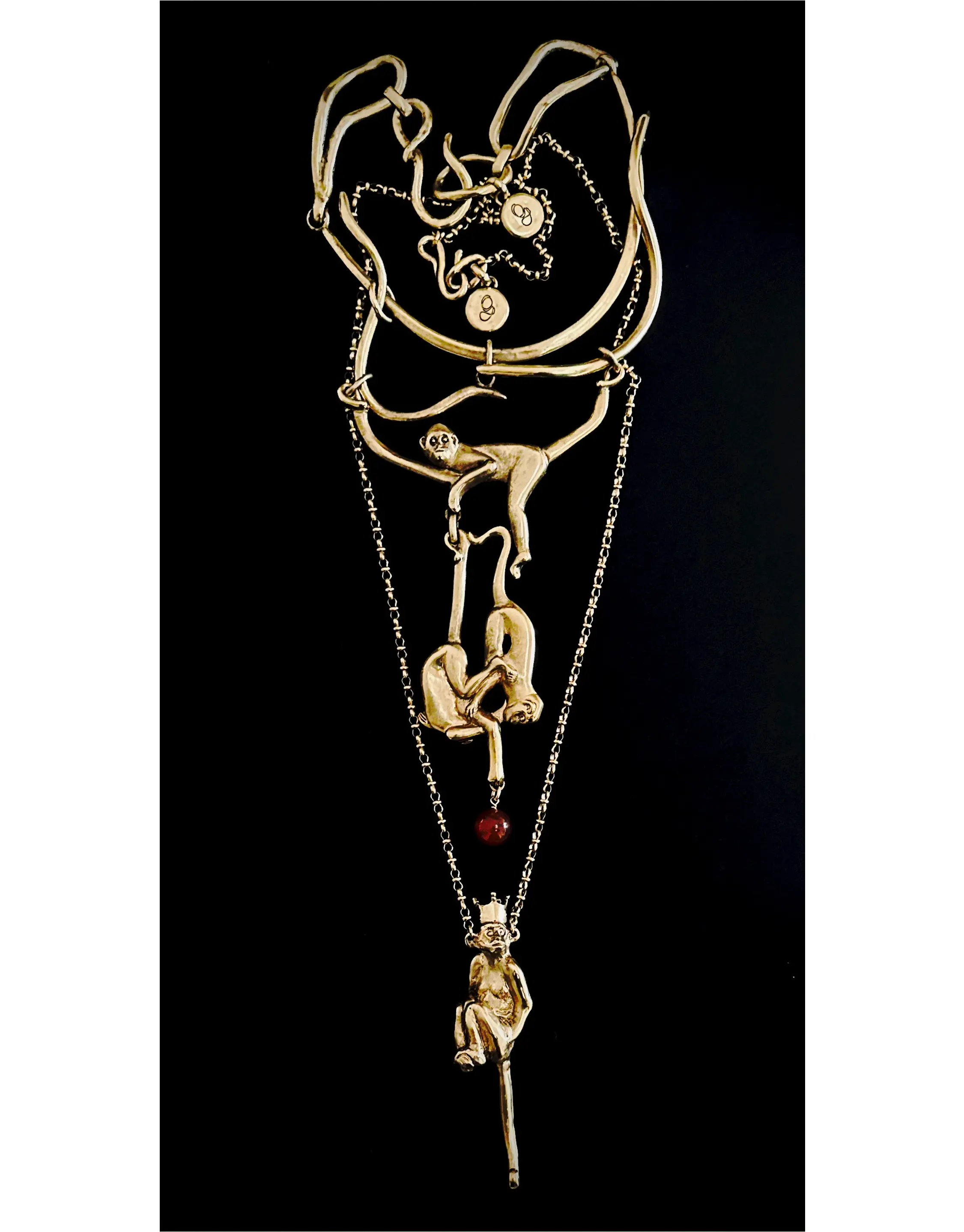 bronze: gold plated, carnelian two colliers total length: 45 cm monkey group: 15 x 10 cm monkey king: 10 x 3 cm